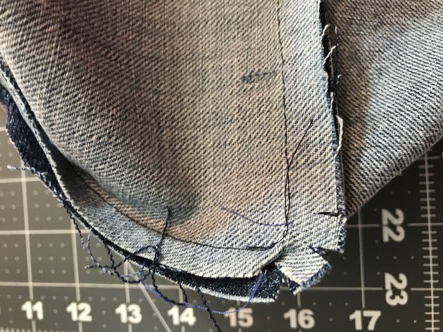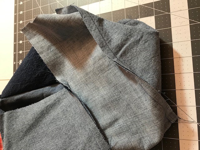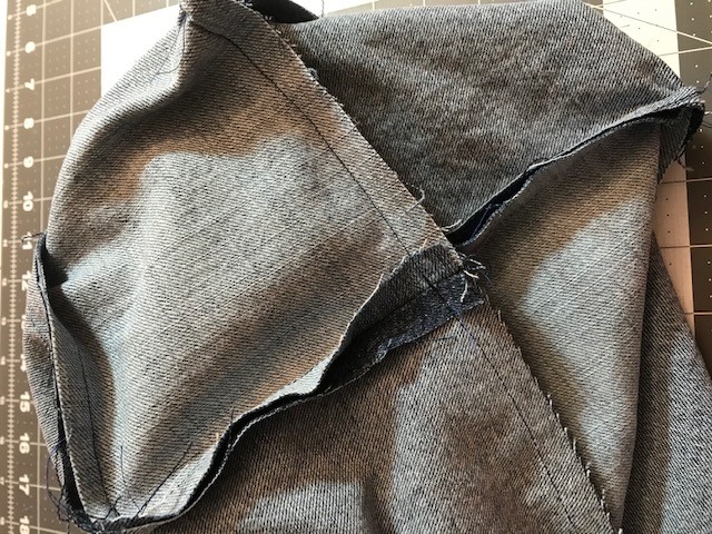 - After stitching, clip the fabric at the 4 peaks but do not cut through the thread. Then turn the bag right side out, using a tool to make sure the peaks are pushed out