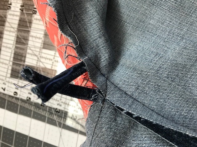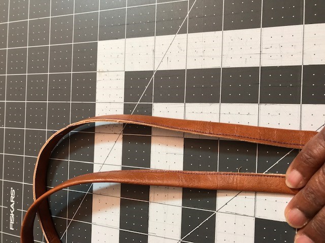 I used a vinyl fabric from JoAnn’s. You can also use fabric that you are making the bag out of. If using denim, make sure that you use a heavy duty needle in your sewing machine. Once you fold over the handle, it will need to penetrate four layers of fabric.
