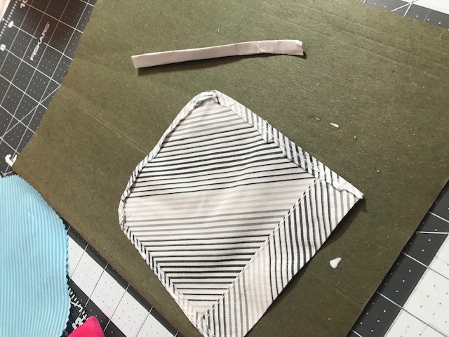 - Press your seams and lay your bag flat for designs. For this bag, I took an old men’s shirt, removed the pockets and glued them to the bag as pockets.